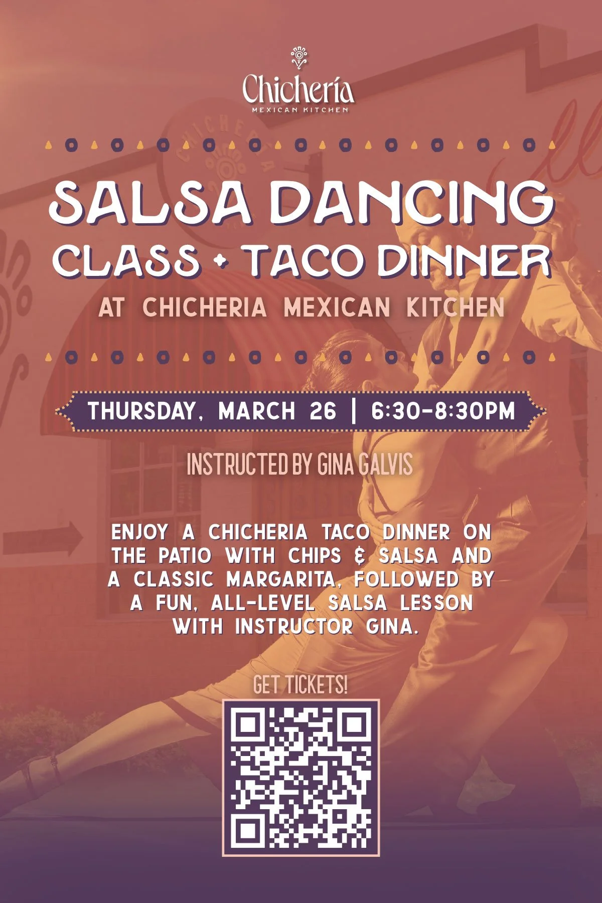 Chichería Mexican Kitchen invites guests to join them for an interactive evening of salsa dancing, tacos, and margaritas at their Salsa Dancing Class + Taco Dinner on Thursday, March 26, 2026. This one-night-only event combines delicious Mexican fare, handcrafted margaritas and an all-levels guided salsa lesson – perfect for date night, an outing with friends, or anyone looking to spice up their week.