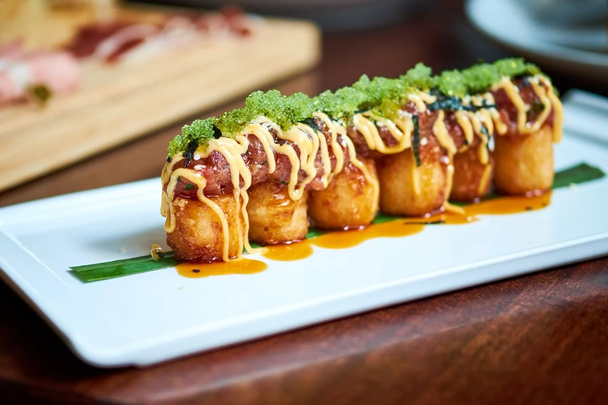 Fried sushi rice served with yellowfin tuna, sriracha mayo, eel sauce, nori and wasbi tobiko