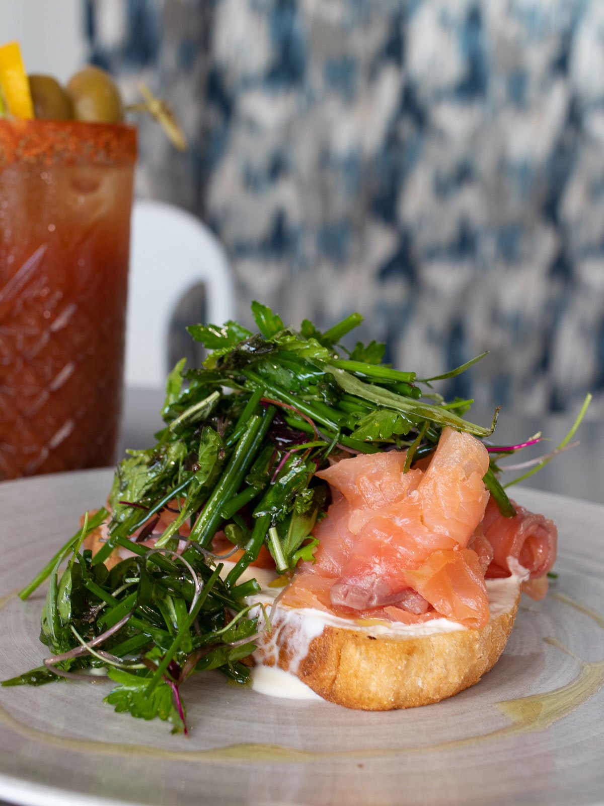 San Francisco salmon toast with grilled sourdough, whipped creme fraiche, house-pickled veggies and picked herb salad