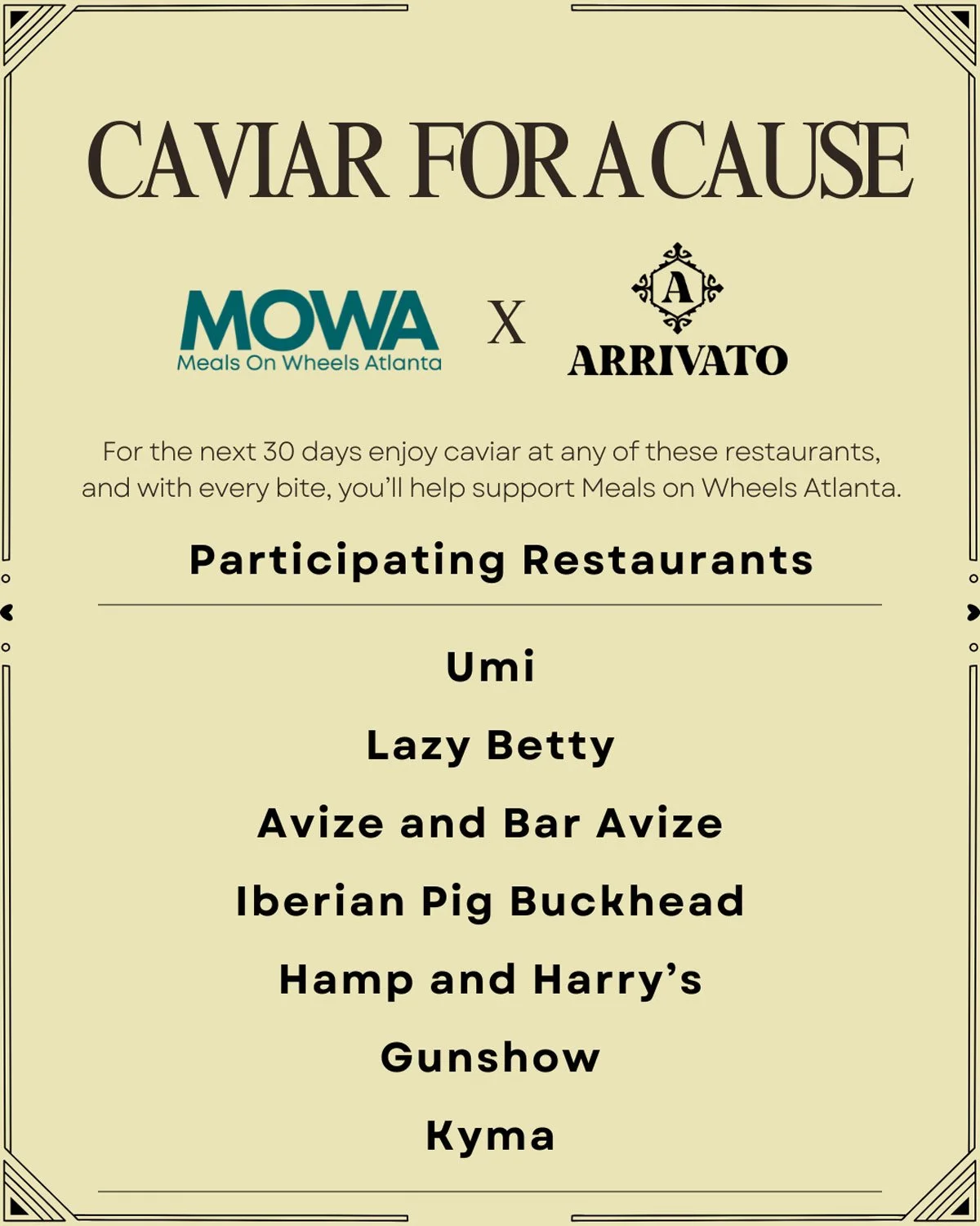 Meals On Wheels Atlanta has partnered with Arrivato Imports to launch Caviar for a Cause, a delicious way to give back. Beginning August 13 and continuing through Sept. 13, 2025, diners can indulge in luxurious caviar dishes at select Atlanta restaurants—Umi, Lazy Betty, Avize and Bar Avize, Iberian Pig Buckhead, Hamp & Harry’s, Gunshow and Kyma—knowing a portion of each caviar order directly benefits Meals On Wheels Atlanta. This unique partnership helps provide nourishing meals and essential support to local seniors in need.