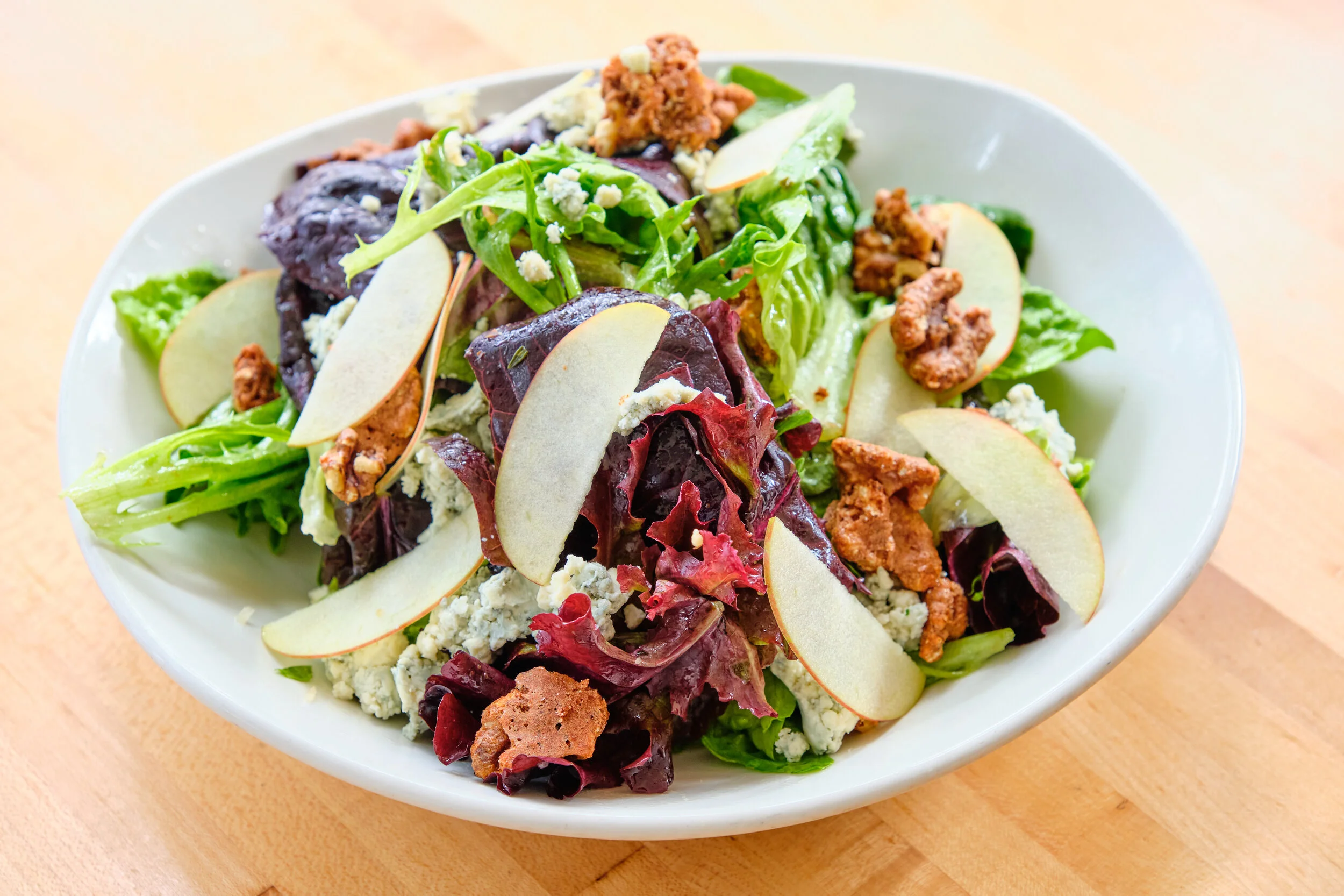 North Georgia apples, spiced walnuts and Gorgonzola cheese perfectly complement the baby farm lettuces for a light start to your meal at Seed Kitchen & Bar.