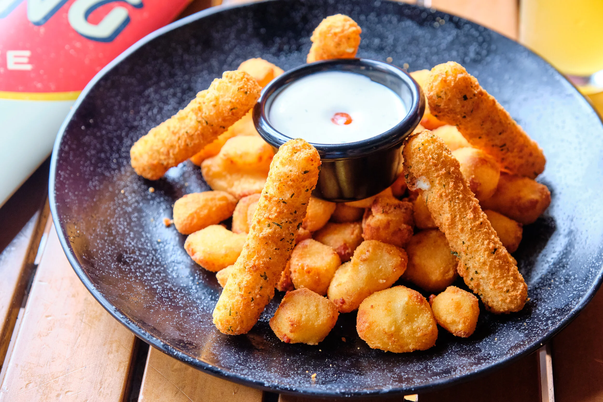 The only thing better than deep-fried cheese is two different kinds of deep-fried cheese! Wild Wing Cafe's del fuego cheese platter is sure to please with mozzarella sticks and cheese curds with sriracha ranch for dipping.