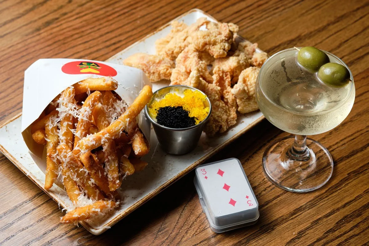 Available only by word of mouth, this playful throwback is part cocktail bar, part childhood comfort—with a cheeky wink. For just $15, guests get crispy chicken “nuggies” and Parmesan truffle fries with house-made crème fraîche tartar sauce topped with tobiko roe, adding a subtle, briny seafood pop typically found in upscale sushi bars. An ice-cold dirty gin martini, shaken to crystal perfection, rounds out the experience.